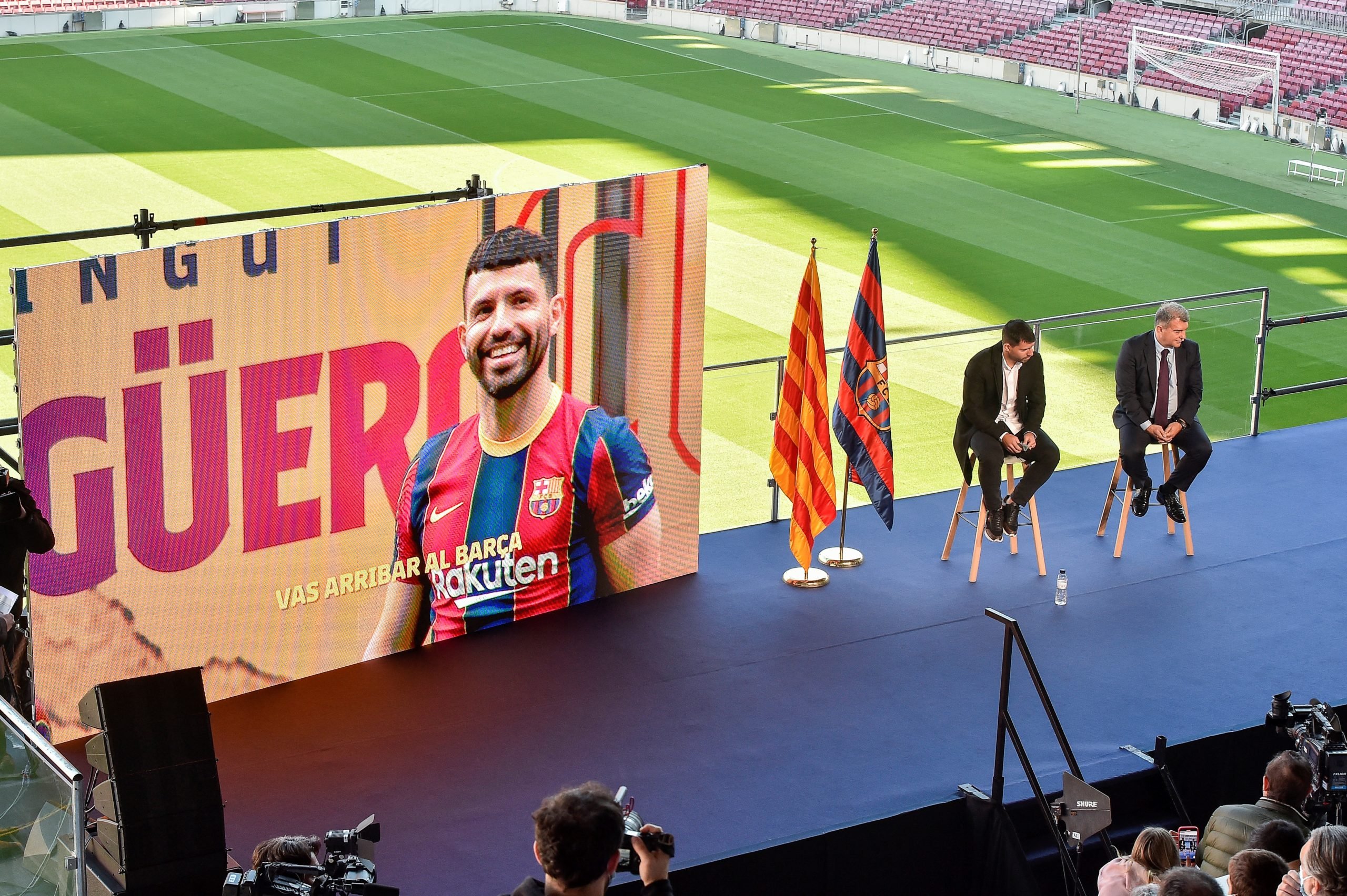 - Barcelona’s Argentinian forward Kun Aguero (C) and Barcelona’s Spanish President Joan Laporta (R) address a press conference to announce his retirement from football, at the Camp Nou stadium in Barcelona, on December 15, 2021. (Photo by Pau BARRENA / AFP)