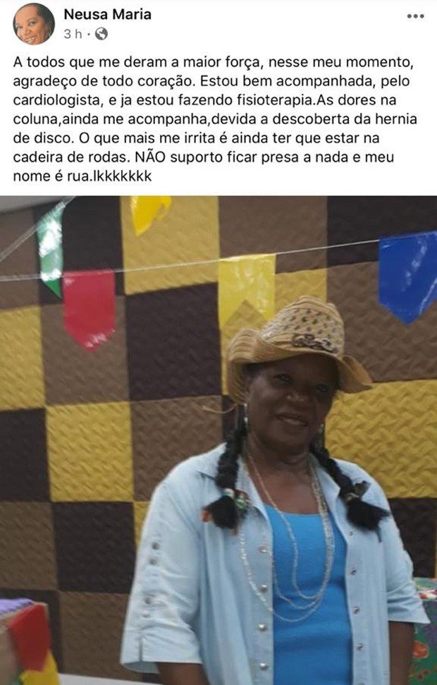 No mês de agosto a atriz Neusa Borges foi foi diagnosticada com hérnias de disco e precisou ficar internada para se recuperar. Agora, já recuperada, ela utilizou o Facebook nessa quinta-feira (17) para tranquilizar amigos e fãs que se preocuparam com sua saúde nas últimas semanas.