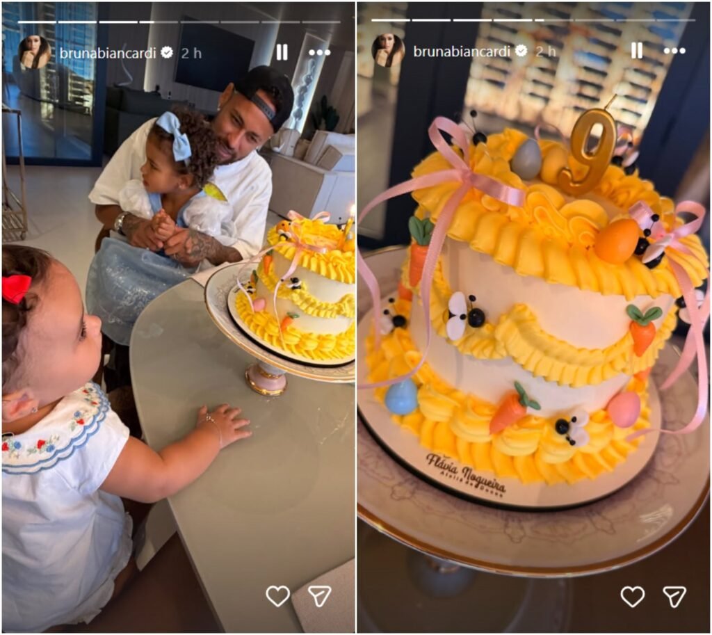 Bruna Biancardi, 31 anos, compartilhou com seus seguidores no Instagram registros da celebração pelo 9º mesversário de Mel, sua segunda filha com Neymar, 34, nesta segunda-feira, 6. Em um dos cliques, a pequena aparece ao lado do pai, enquanto a primogênita do casal, Mavie, de 2 anos, está no colo do atleta.
