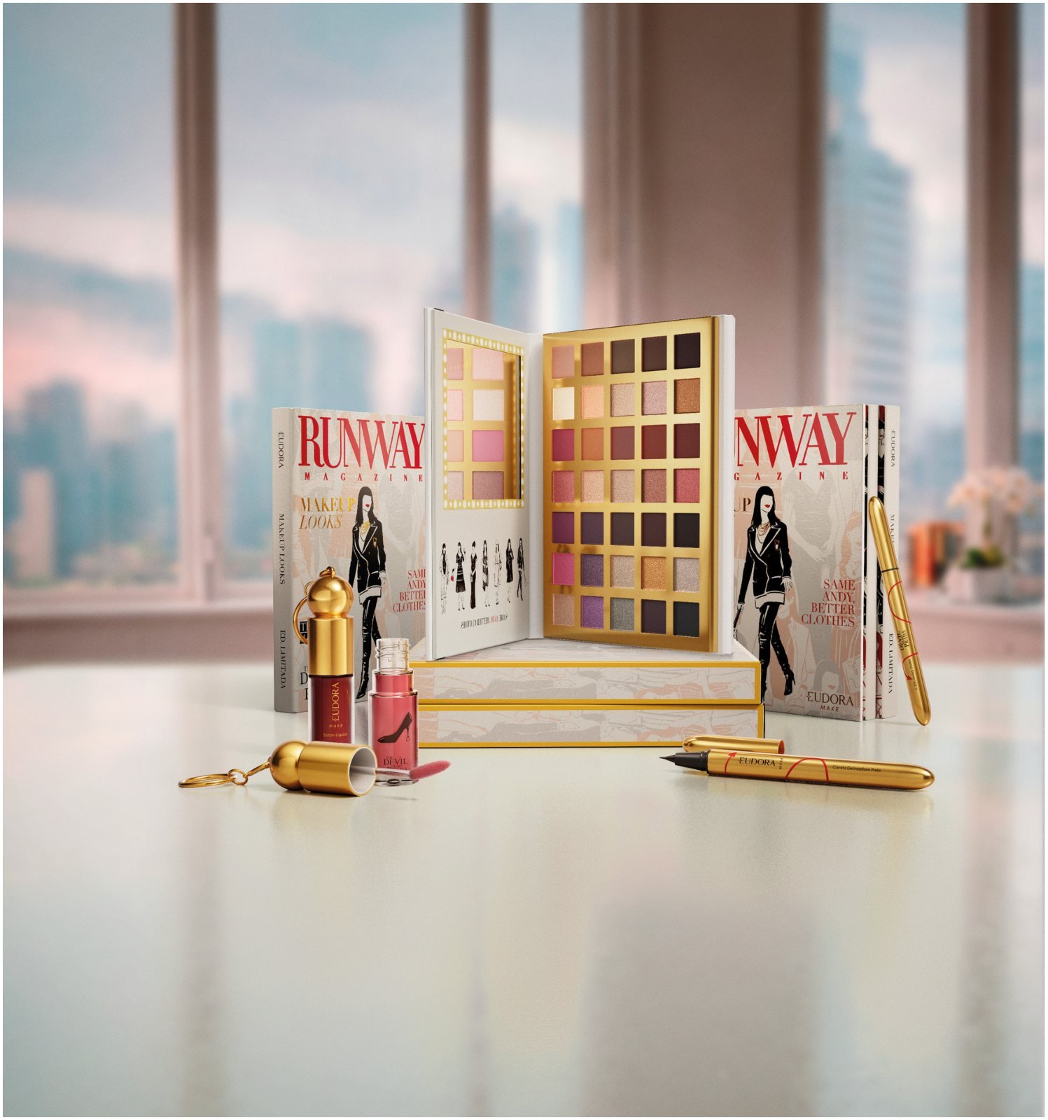 A coleção é composta pela Palette Runway Magazine, com 35 sombras em diferentes acabamentos: acetinado, matte, superbrilho e cremoso, que permitem criar desde produções clássicas até propostas mais ousadas. O Batom Líquido Fashion Icon, disponível em quatro tonalidades, vermelho, vinho, marrom e nude, traz acabamento cremoso e brilhante, com uma embalagem especial. Já a Caneta Delineadora Iconic Liner, em duas versões, preto e bordô, conta com ponta ultraflexível que garante traços precisos, destacando o olhar como elemento central.