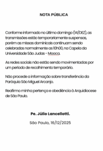 Em uma nota oficial, Júlio confirma o afastamento das redes, mas nega novamente a saída da paróquia. “Reafirmo minha pertença e obediência à Arquidiocese de São Paulo”.