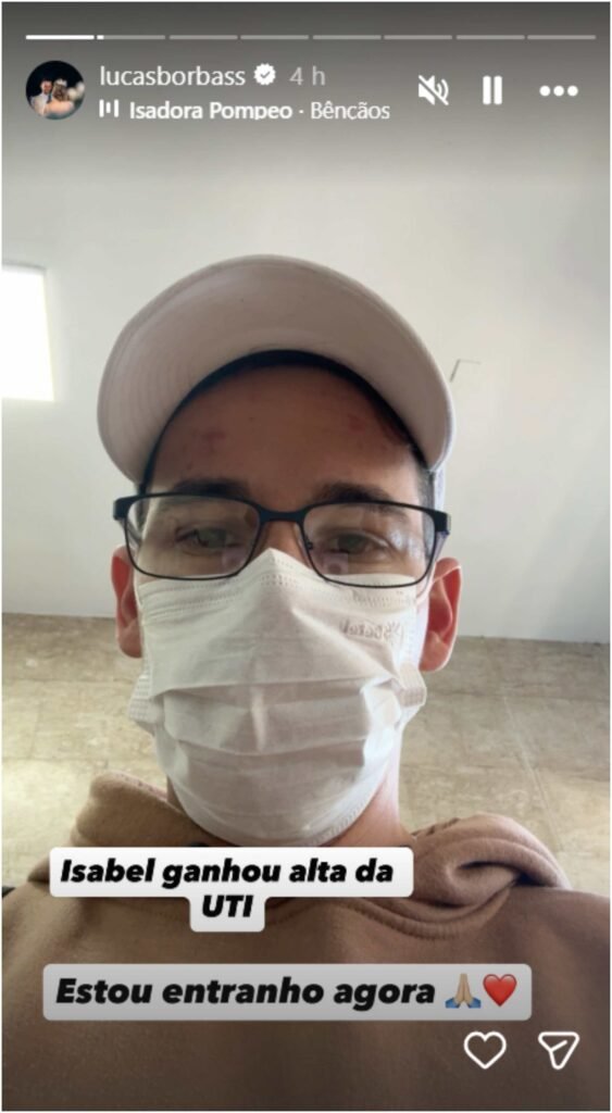 Na última quinta, 27, em vídeo publicado nos Stories do Instagram, Lucas apareceu chorando e pedindo oração para a esposa. Ele contou que Isabel passou “muito mal” durante a madrugada e que no hospital foi constatado que ela estava com excesso de magnésio no sangue. “Depois disso, a Isabel parou de respirar e de ter saturação”, comunicou ela aos seguidores.