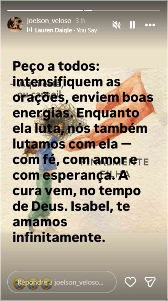 Mesmo diante do momento delicado, ele demonstrou confiança na recuperação da jovem, que está internada há uma semana. “A cura vem, no tempo de Deus. Isabel, te amamos infinitamente”, finalizou.