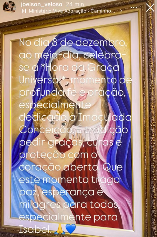 Joelson Veloso, pai da influenciadora digital Isabel Veloso, 19 anos, voltou a usar seu perfil no Instagram para pedir por orações à sua filha, nesta segunda-feira, 8. A influenciadora digital está internada em estado grave desde o dia 27 de novembro, após ser diagnosticada com pneumonia, durante tratamento de câncer. Na postagem, ele escreveu: “Vamos nos unir em oração, por cura, por força, por paz. Por Isabel, por todas as famílias, por todos que precisam de um milagre”.