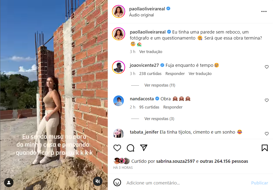 “Eu tinha uma parede sem reboco, um fotógrafo e um questionamento. Será que essa obra termina?”, escreveu ela na legenda da publicação.