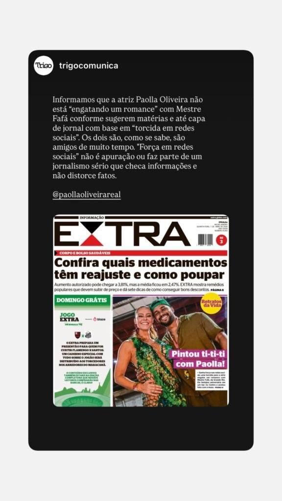 Por meio de uma nota da sua assessoria de imprensa, publicada nos Stories do Instagram, a atriz negou o romance e enfatizou que os dois são apenas amigos. “Informamos que a atriz Paolla Oliveira não está ‘engatando um romance’ com Mestre Fafá conforme sugerem matérias e até capa de jornal com base em ‘torcida em redes sociais'”, começou,