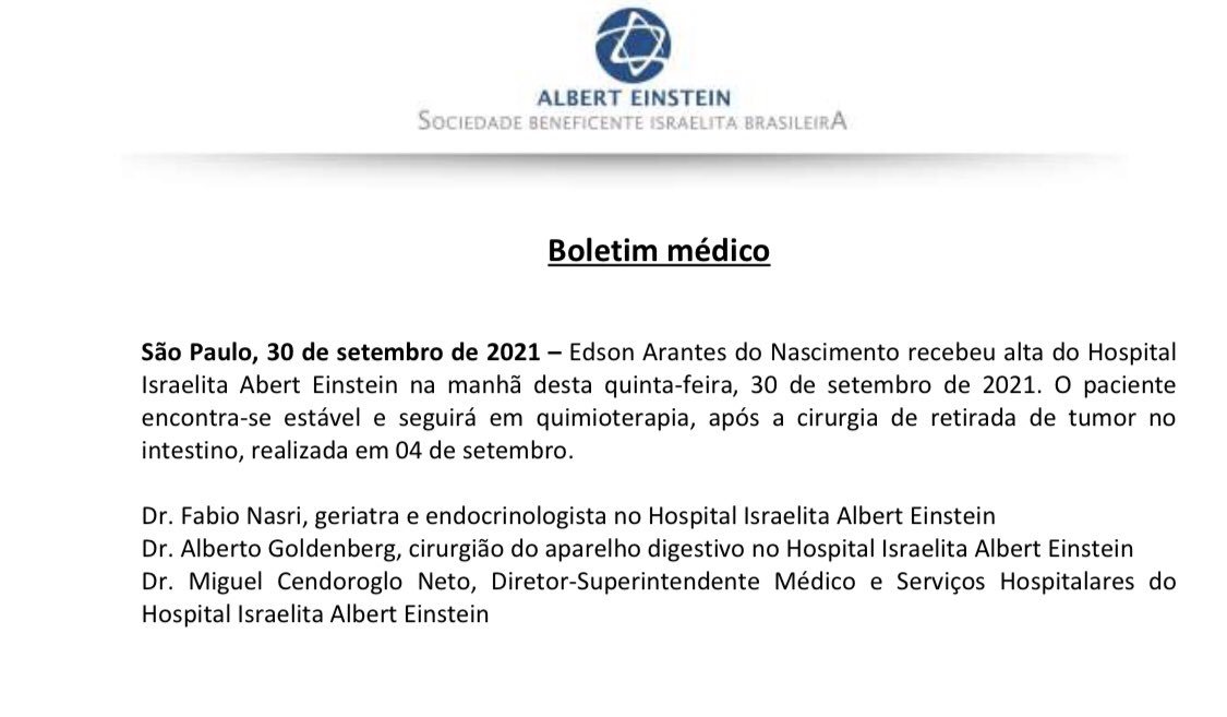 “Edson Arantes do Nascimento recebeu alta do Hospital Israelita Abert Einstein na manhã desta quinta-feira, 30 de setembro de 2021. O paciente encontra-se estável e seguirá em quimioterapia, após a cirurgia de retirada de tumor no intestino, realizada em 04 de setembro”, diz boletim médico do Albert Einstein.