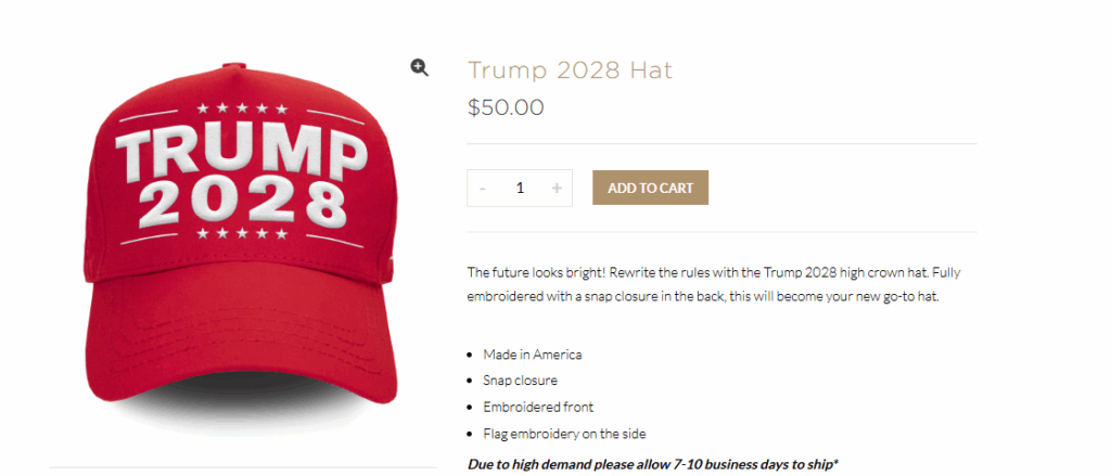 Já Trump tem flertado com a ideia da reeleição e exibiu bonés com a estampa “Trump 2028” em reunião com líderes democratas — os itens são comercializados por US$ 50 na loja oficial de suas empresas (veja abaixo). “Estou com os melhores índices de aprovação da minha vida”, afirmou recentemente.