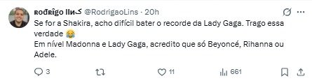 “Latina forever”, afirmou um internauta. “Fui no show da Shakira ano passado e digo com tranquilidade que foi um dos melhores shows que já fui. A maior artista da América Latina não poderia vir no melhor cenário”, concordou um segundo. “E os brasileiros tratando a Shakira como se ela tivesse começado semana passada?”, se indignou outro. “Show chato, repertório fraco. Salva só 3/4 músicas primeiro show de mais de 1h”, comentou ainda uma quarta pessoa.