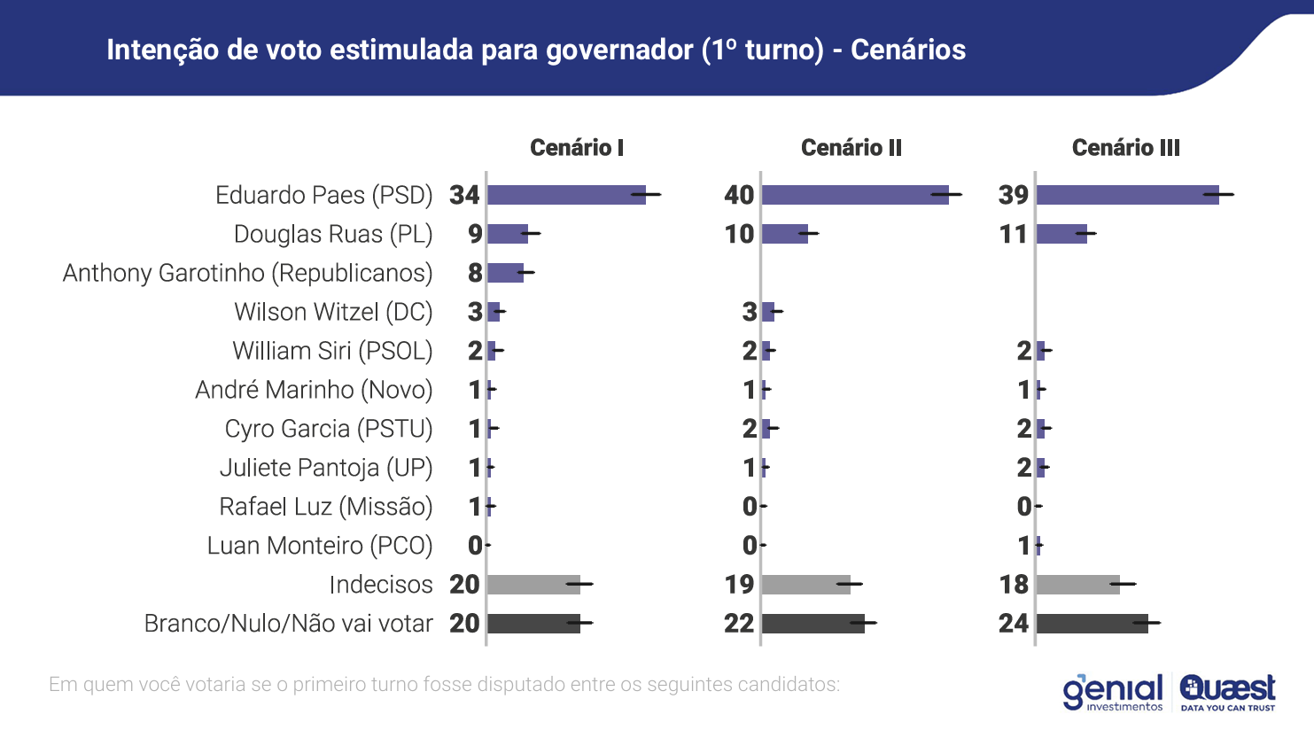 No primeiro cenário de 1º turno, além de Paes e Ruas, figuram nomes como Anthony Garotinho (Republicanos), com 8%, e Wilson Witzel (DC), com 3%. William Siri, do Psol, tem 2%. Já André Marinho (Novo), Cyro Garcia (PSTU), Juliete Pantoja (UP) e Rafael Luz (Missão) somam 1% cada. Luan Monteiro (PCO) não pontuou. O grupo de indecisos soma 20%, mesmo percentual registrado para votos brancos, nulos ou de eleitores que afirmam que não pretendem votar.