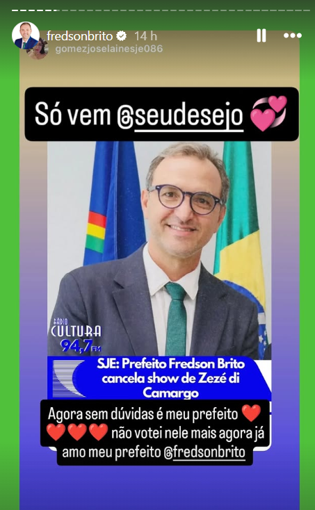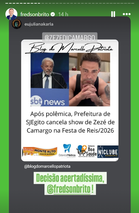 Em seu perfil oficial no Instagram, Fredson compartilhou postagens celebrando o cancelamento da ida de Zezé à São José do Egito. O perfil da cidade na mesma rede social já anunciou o novo cartaz do evento sem a presença do cantor sertanejo e já com os substitutos na imagem. Na legenda da postagem, os seguidores comemoraram a decisão de Brito. Confira abaixo: