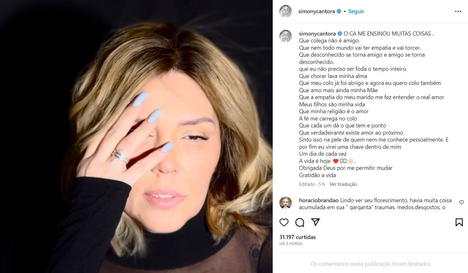 A cantora Simony fez um desabafo emocionante nas redes sociais para falar do seu processo de tratamento contra o câncer que vem enfrentando desde agosto do ano passado.