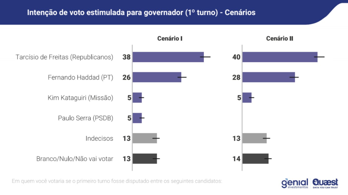 Na simulação de primeiro turno, Tarcísio soma 38% das intenções de voto estimuladas no Cenário I, e 40% no Cenário II. O petistas aparece em segundo lugar, com 26% e 28%, respectivamente, seguido por Kim Kataguiri (Missã), que registra 5% nos dois cenários.