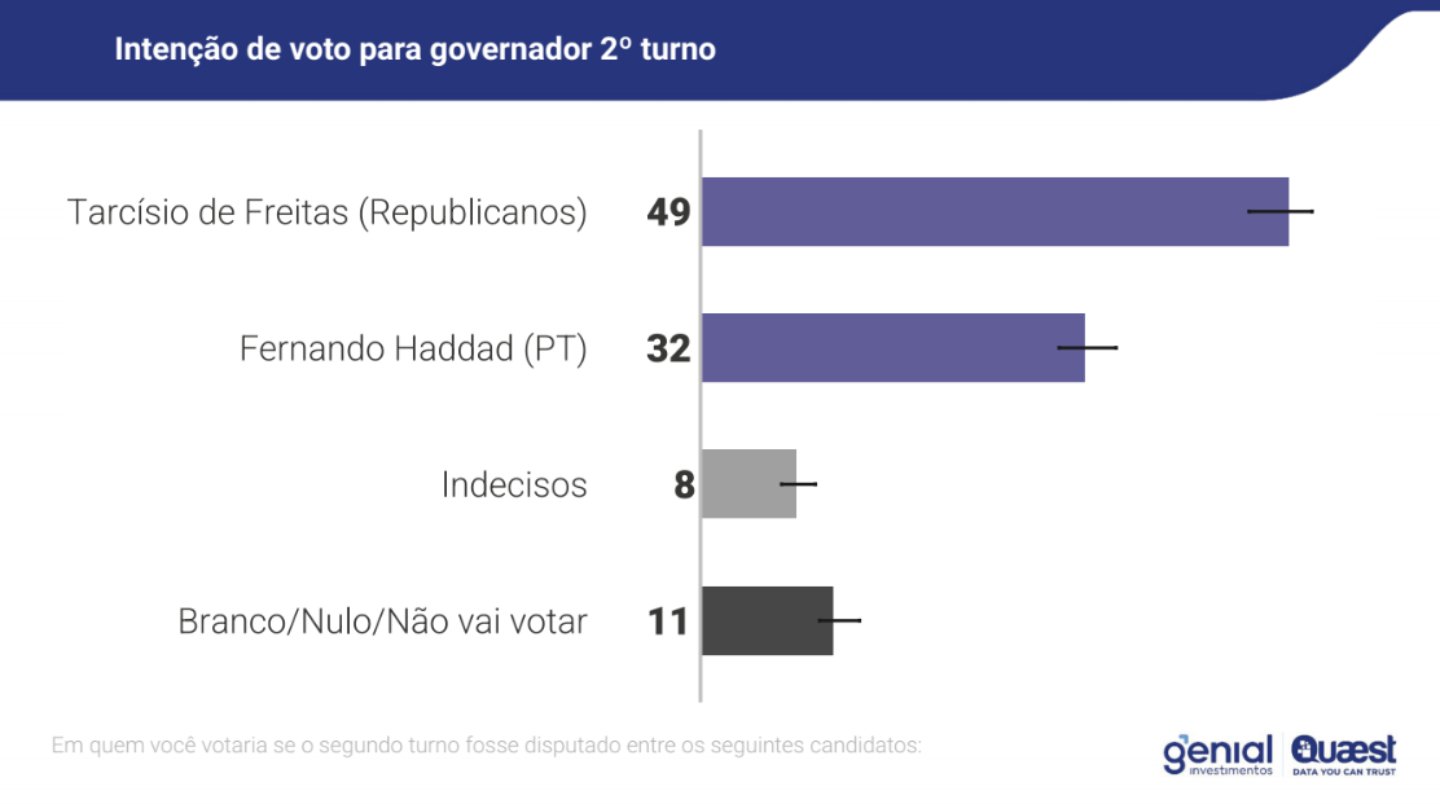Nas simulações de um possível segundo turno, o atual governador de São Paulo venceria todos os oponentes com folga. O republicano conquista 49% das intenções de voto. Já Haddad soma 32%, indecisos soma 8% e voto branco/nulo/não vai votar registra 11%.
