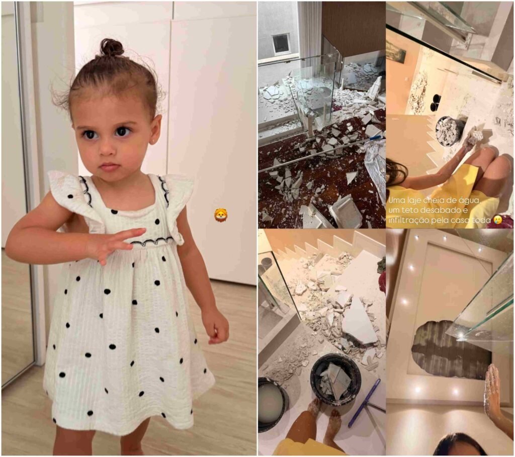 “A chuva da semana passada trouxe um presentinho de Natal antes da hora”, ironizou ela enquanto exibia rachadura no teto e pedaços de gesso espalhados pelo chão. “Uma laje cheia de água, um teto desabado e infiltração pela casa toda”, completou ela em uma série de postagens nos Stories do Instagram.