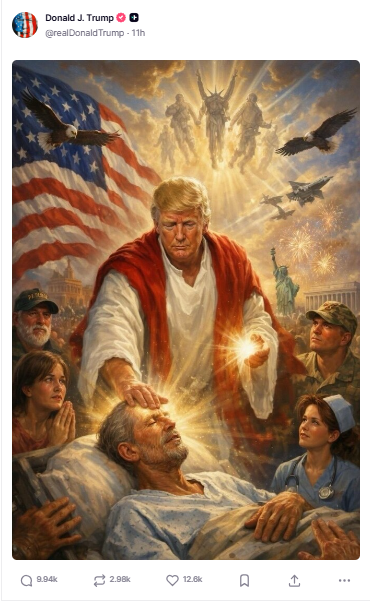 Feita a partir de IA, a imagem representava Trump com as vestes de Jesus, rodeado de apoiadores. O presidente é mostrado com feixes de luzes nas mãos enquanto “cura” um homem acamado. Assim como as demais publicações do americano, a provocação foi veiculada na rede social Truth Social — mas já não está disponível na conta do mandatário.