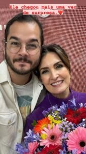 “Ele chegou mais uma vez de surpresa”, escreveu a apresentadora em uma foto com Túlio e um buquê de flores que recebeu.