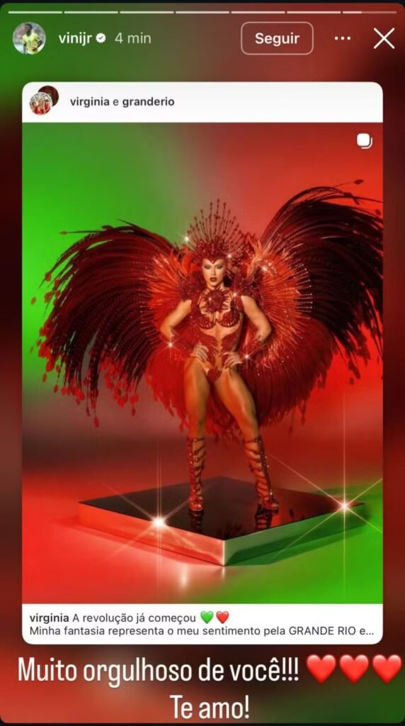Craque do Real Madrid e da seleção brasileira, Vini Jr. usou as redes sociais na manhã desta quarta-feira, 18, para celebrar a estreia da namorada, Virginia Fonseca, no Carnaval do Rio de Janeiro, como rainha de bateria da Grande Rio.