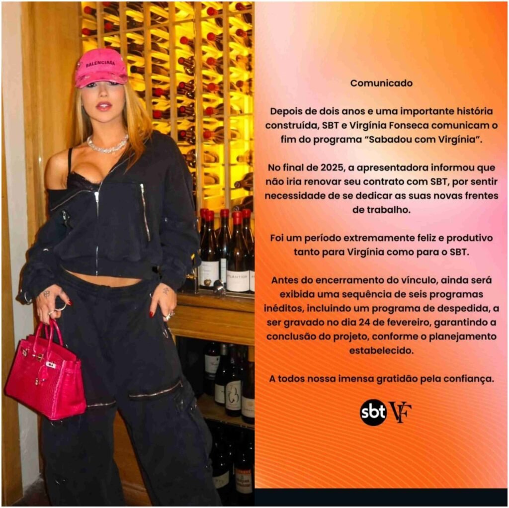 “Depois de dois anos e uma importante história construída, SBT e Virginia Fonseca comunicam o fim do programa ‘Sabadou com Virginia’. No final de 2025, a apresentadora informou que não iria renovar seu contrato com SBT, por sentir necessidade de se dedicar às suas novas frentes de trabalho”, inicia o texto divulgado pelo canal paulista.