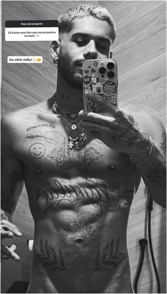 “Zé, posta uma foto que você nunca postou no Insta”, pediu um internauta por meio da caixinha de perguntas. O cantor, então, postou o clique sugestivo, em preto e branco. “Vou voltar melhor”, avisou ele.
